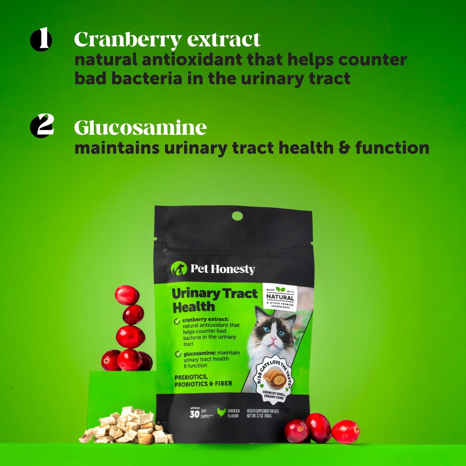 With Pet Honesty’s Urinary Tract Health, your little one will be good to go. Loaded with antioxidants, probiotics, and fiber, it’s a delicious dual-textured supplement designed to support your cat’s urinary tract system while promoting healthy waste elimination & normal bladder function. Made with cranberry extract, a natural antioxidant that helps counter bad bacteria in the urinary tract, glucosamine to support urinary tract function, and prebiotics, probiotics & fiber to support gut health, this supplement is designed to help your cat live their happiest & healthiest life. Plus they’ll love these one-of-a-kind supplements, with a crunchy shell & creamy filling for a combo that cats love.