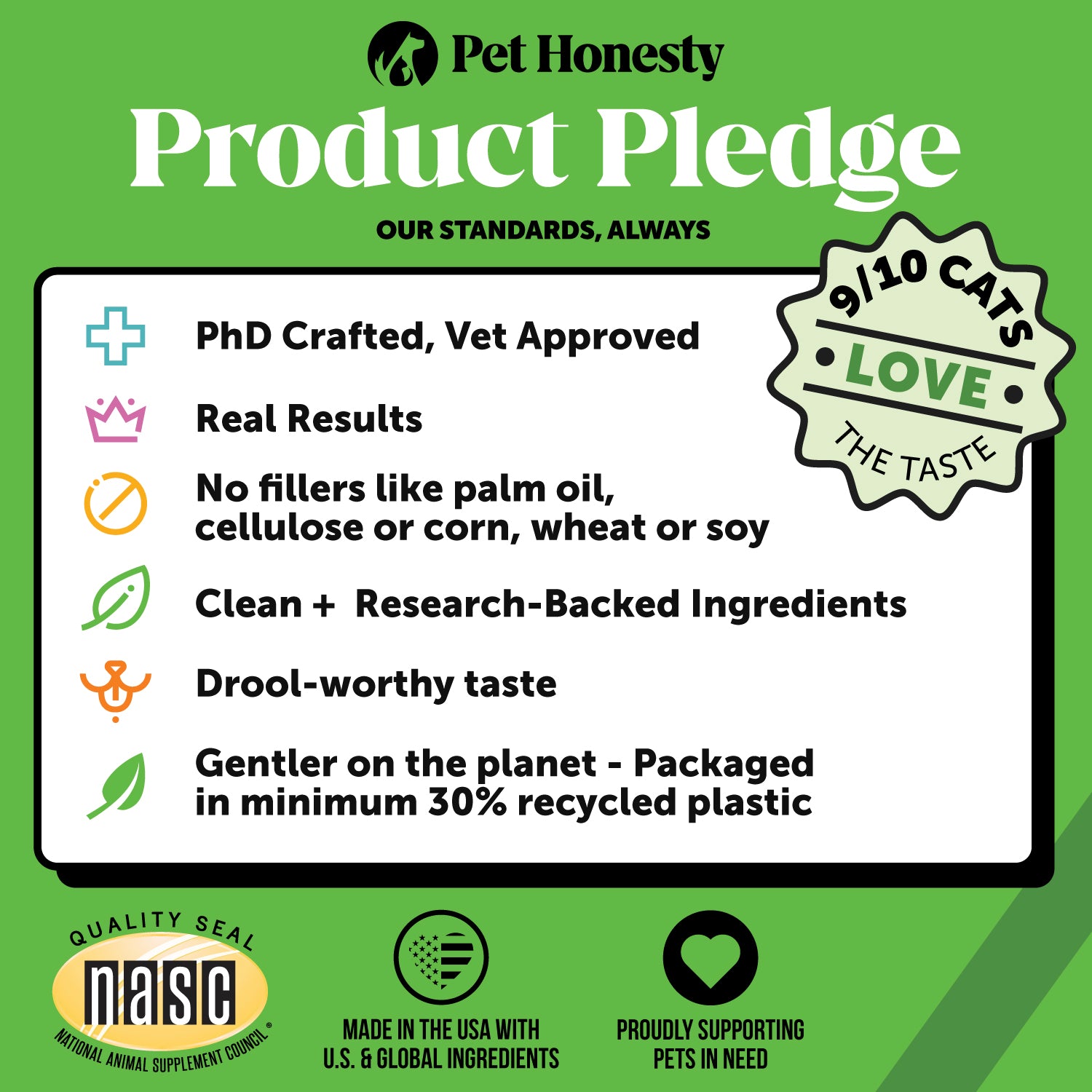 BACKED BY THE PET HONESTY PLEDGE: PhD crafted, Vet approved. Delivering real results. Made with clean + research-backed ingredients. Formulated without fillers like corn, wheat, soy, cellulose or palm oil. No artificial preservatives, colors or flavors. Drool-worthy taste. Gentler on the planet – packaged with minimum 30% recycled plastic.